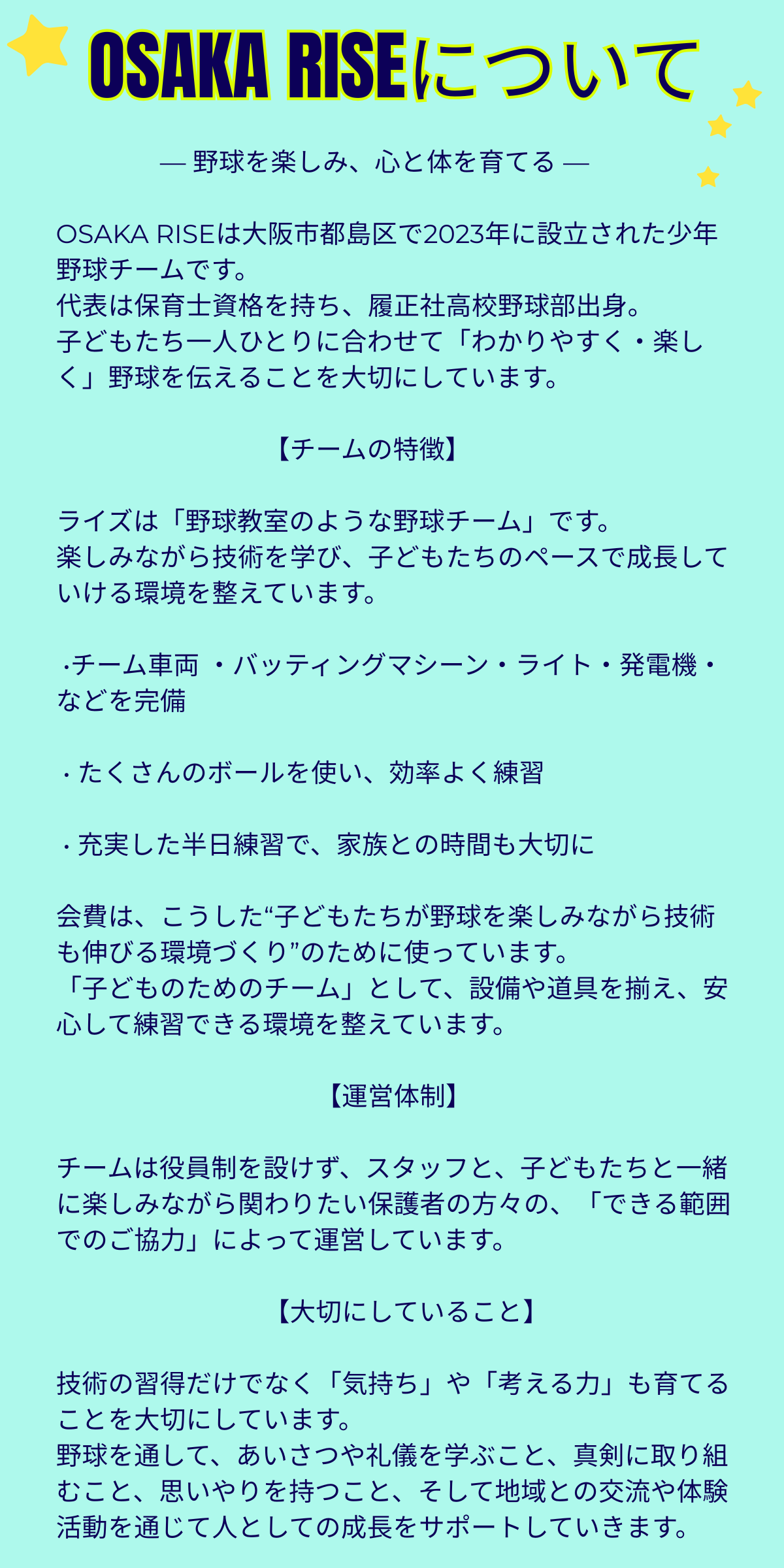入会時にいただく費用 ・入会費・初年度道具協力費・スポーツ保険代: 16,940円 月会費 ・ 基本: 10,000円 ・ 週1回のお子さま(年長~2年生): 7,500円 車両維持費 ・ チーム車両(ハイエース・ノア)の保険代や維持費に充てます ・ 月額: 1,000円(2年生~) ・ 遠征や大会で車に乗る際は、1回500円の移動費を別途いただきます。こちらも車両維持費に充てさせていただきます 道具協力費 ・ 次年度継続時に納入: 6,800円 ・ バッティングマシンやボールなど、練習道具の補充に使います その他 ・ 合宿やイベントなどは、その都度徴収となります |